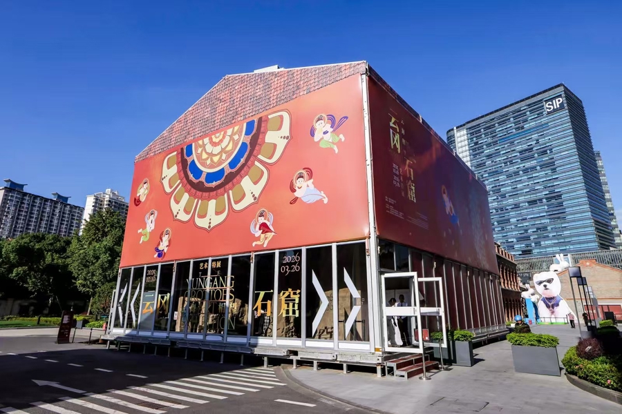 展览采用双展区布展模式,构建兼具学术价值与艺术通感的观展路径,使观众“看见从未看见,听到从未听到”。位于今潮8弄海派文化中心区的户外展区以云冈第12窟“音乐窟”为核心,呈现全球首例可移动3D打印1:1复制洞窟,观众可自由探索千年石窟细节,欣赏北魏天宫伎乐翩跹;趣看美术馆室内展区则分为“化相”“匠道”“光息”“神往”四个单元,以多重维度讲述云冈艺术世界。云冈石窟最具标志性的第20窟佛首,以及在沪重现的第20窟西立佛,也作为本次特展的重磅展品亮相。